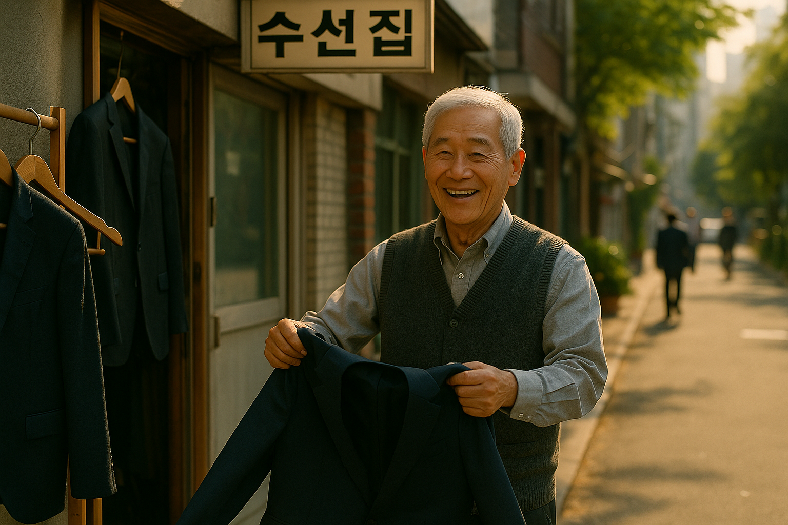 수선집 앞, 사람들은 바삐 출근길을 걷고 그 안에선 조 씨가 천천히 하루를 다려내고 있다.